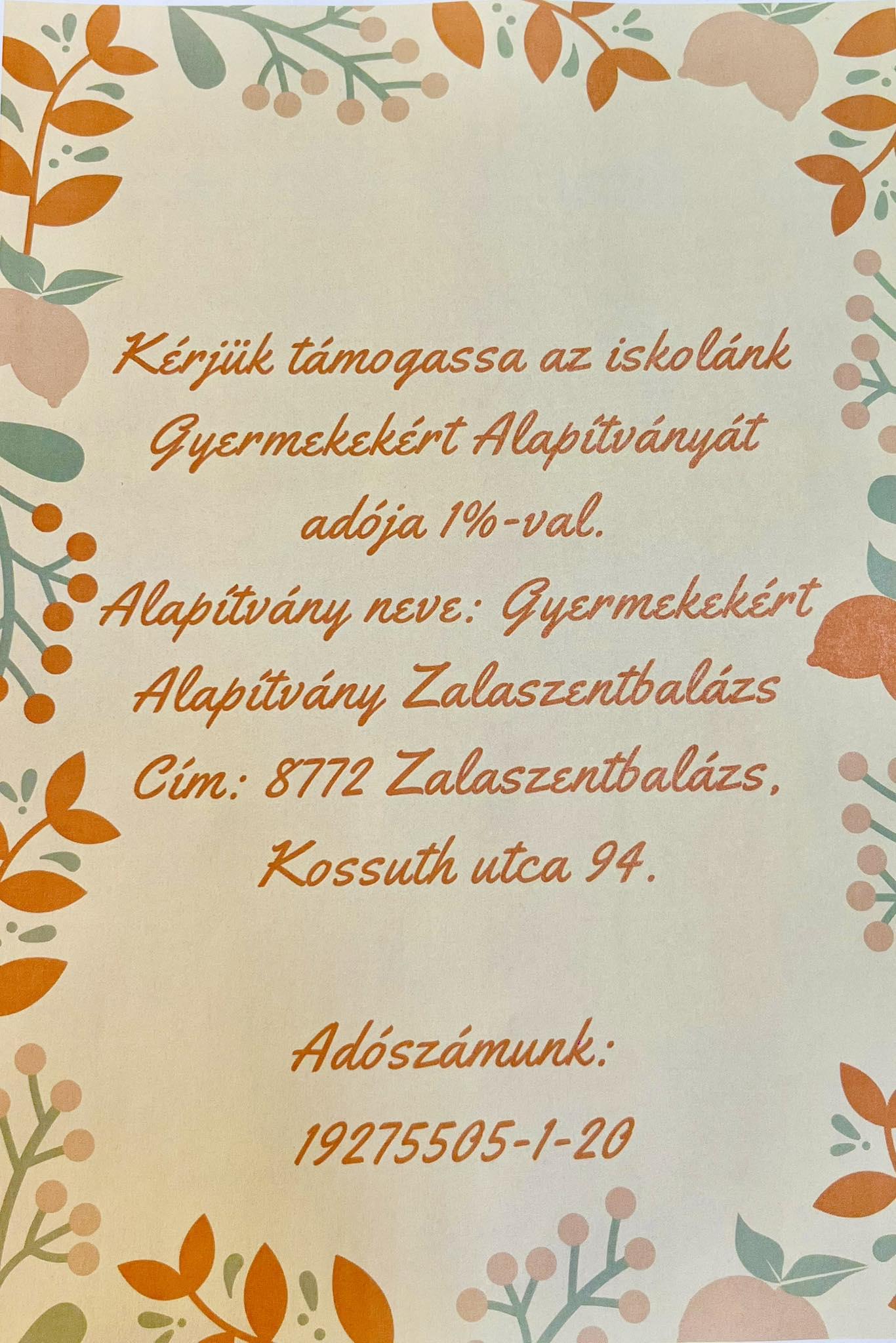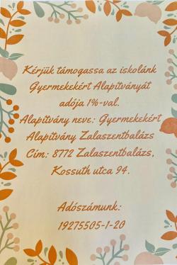 Hírek 1 százalék 2026. 2026. február 25., szerda @ 15:09 Kérjük támogassa iskolánk Alapítványát! Kapcsolódó galéria 1 százalék 2026. Megosztás